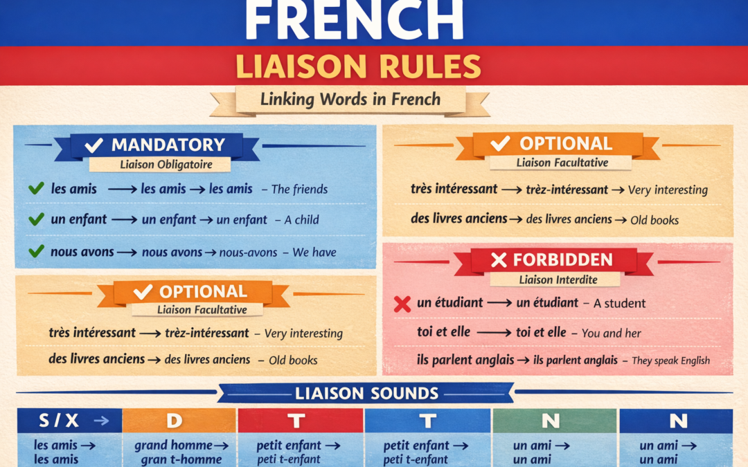 Although it may seem complicated at first, it follows clear patterns. By learning the rules for mandatory, optional, and forbidden liaison, you will improve both your listening and speaking skills.